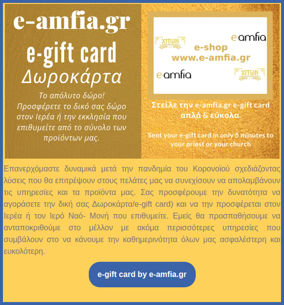 Στο πλαίσιο αυτό σας προσφέρουμε την δυνατότητα να αγοράσετε την δική σας (Δωροκάρτα/e-gift card) και να την προσφέρεται στον Ιερέα ή τον Ιερό Ναό- Μονή που επιθυμείτε.